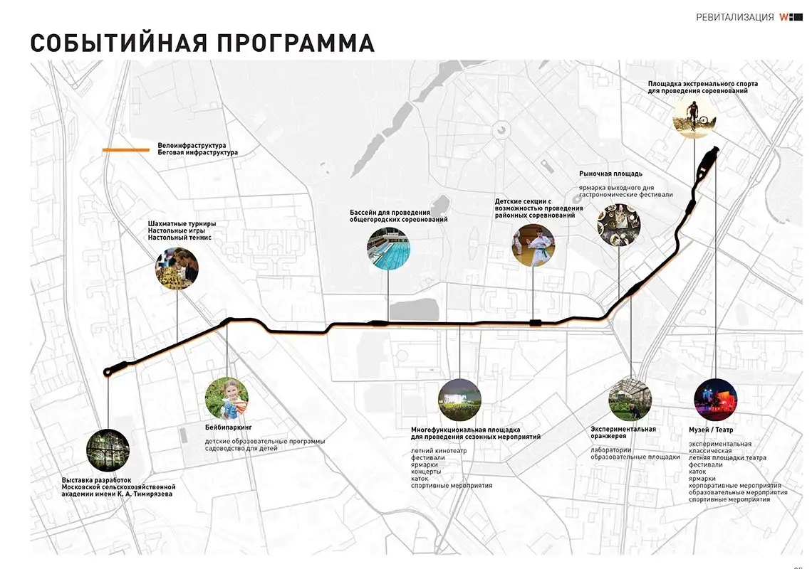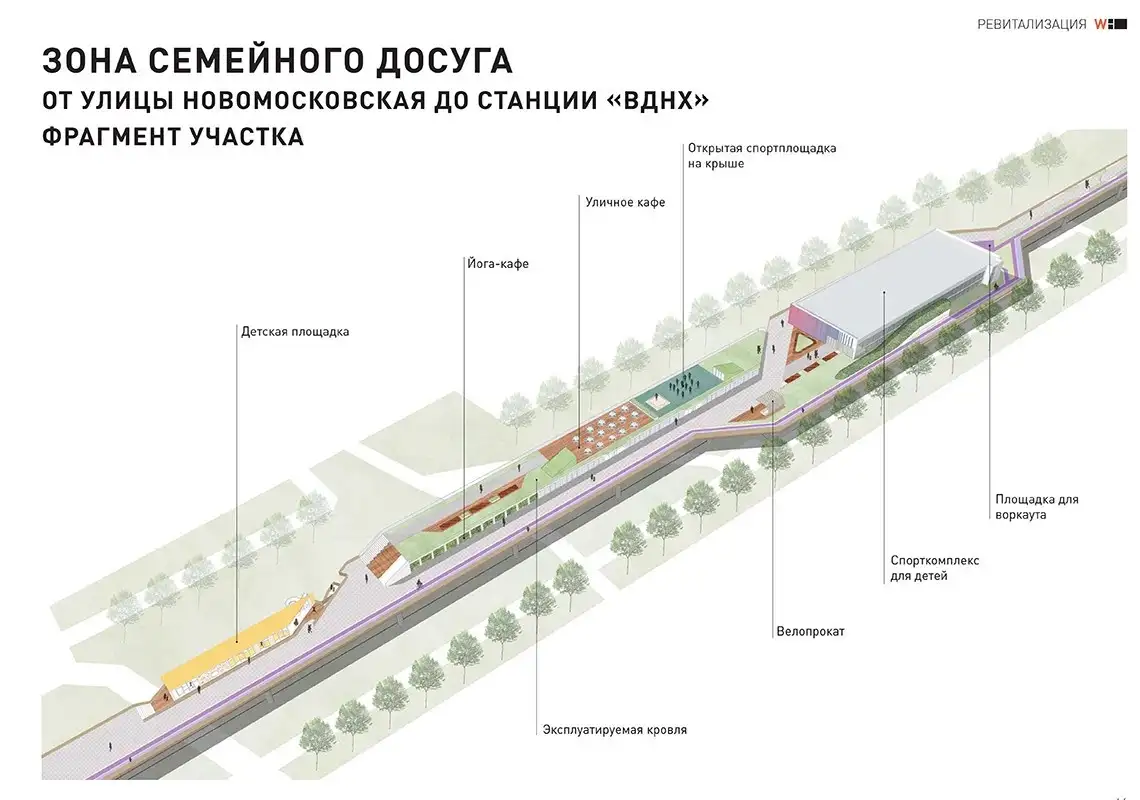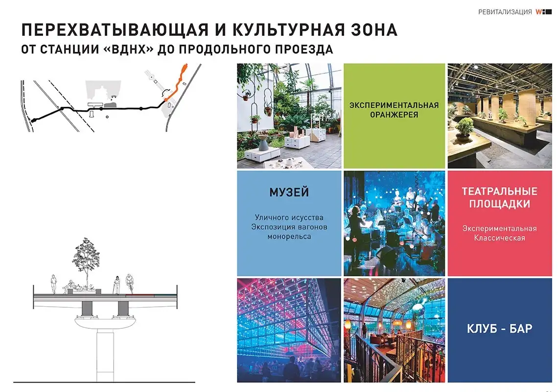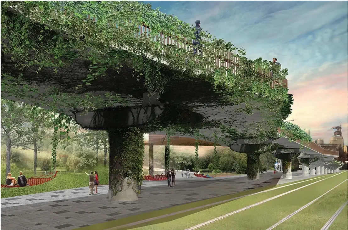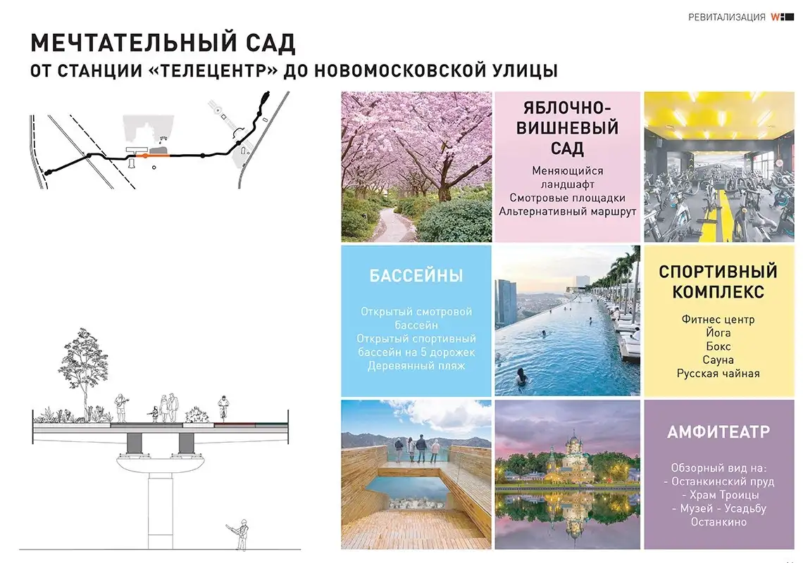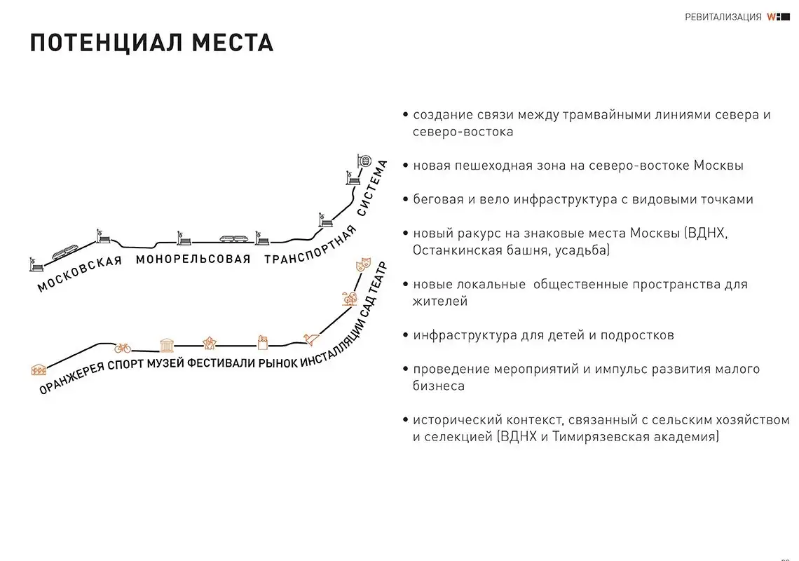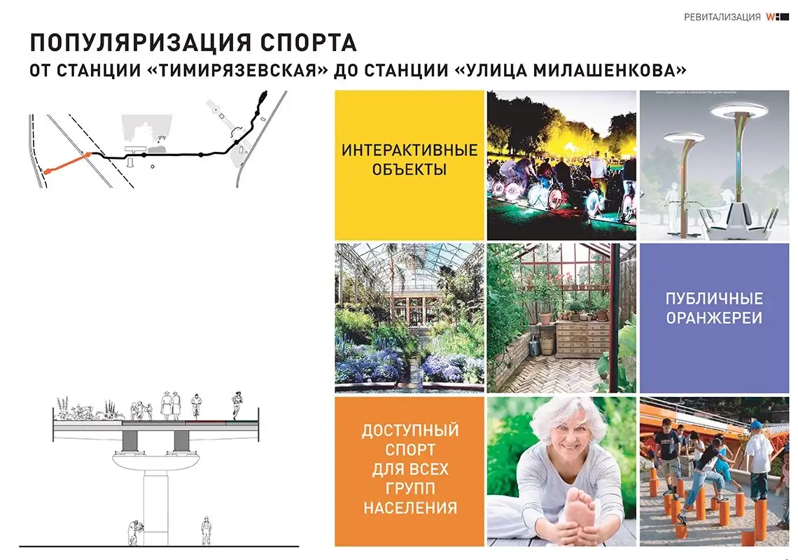 High Line в Нью-Йорке. Но полностью перенести этот опыт на нашу площадку невозможно. Вокруг очень много существующих парков хорошего уровня. Это ВДНХ с большим разнообразием рекреационных предложений, очень красивый исторический парк «Останкино», Тимирязевский лес. Есть все типы парковых рекреаций.