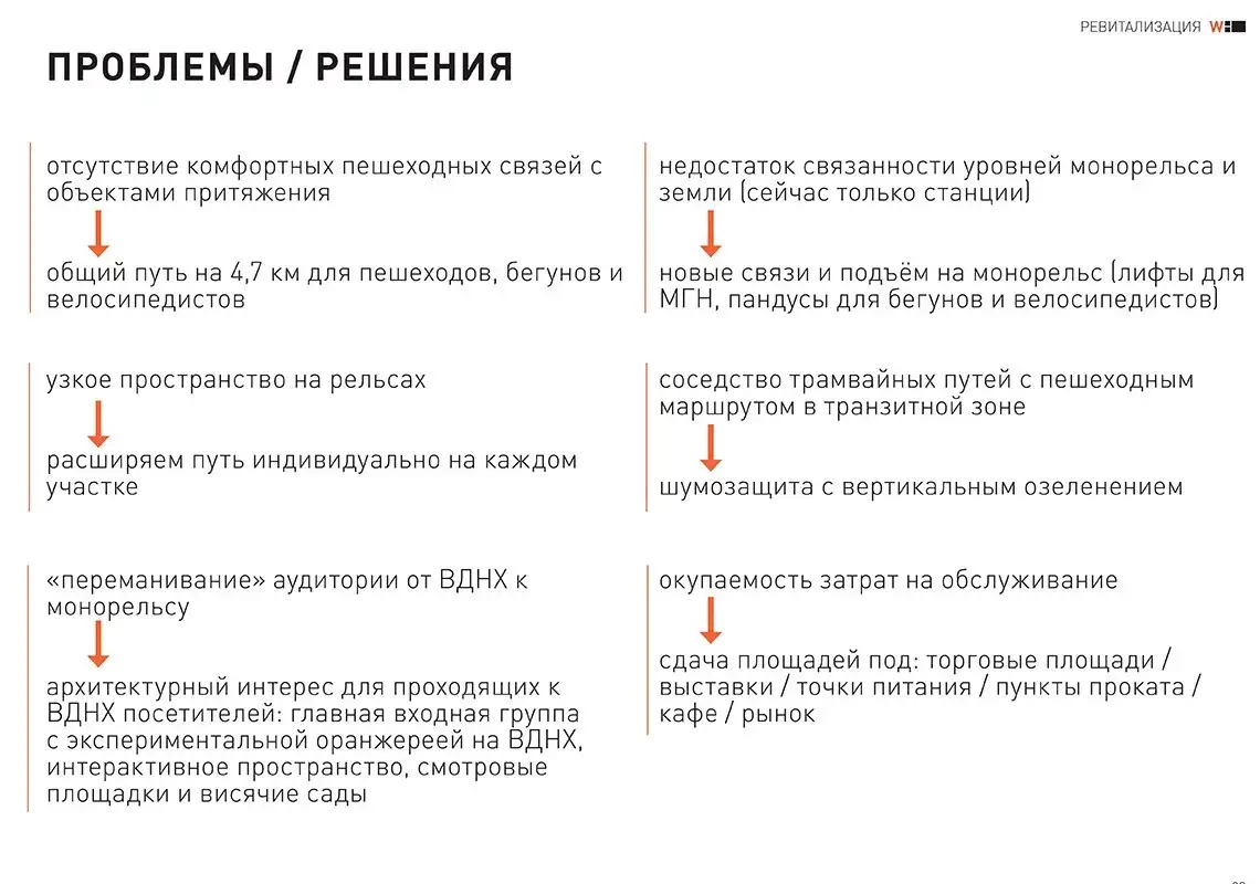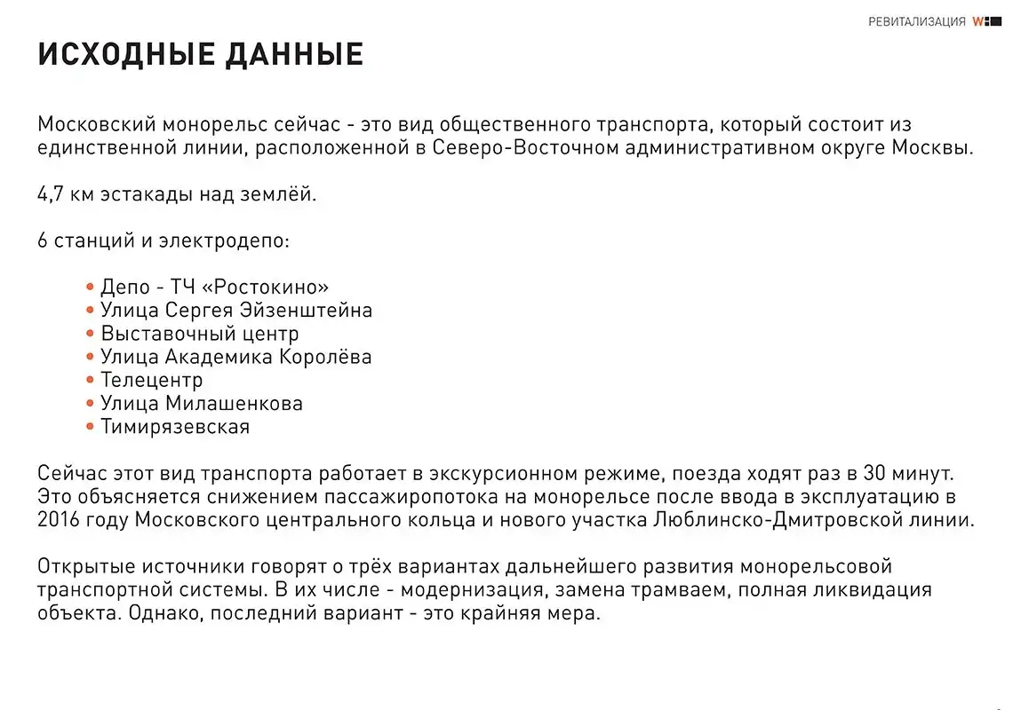 Монорельс связывает Тимирязевский район и ВДНХ. Я живу в Тимирязевском, и два года почти каждый день ездила на авторский надзор на ВДНХ, где строила городскую ферму. Мне очень нравится этот вид транспорта, для меня он удобен. Но также я понимаю, что он абсолютно бесперспективен. Транспортная связь между районами сохранится. Монорельс в большей его части дублирован трамваем. Департамент транспорта города собирается продолжить эту трамвайную линию и соединить с другой линией в Тимирязевском районе.