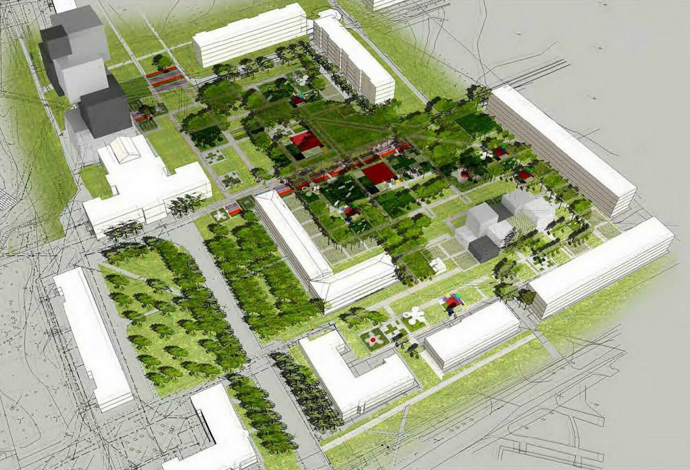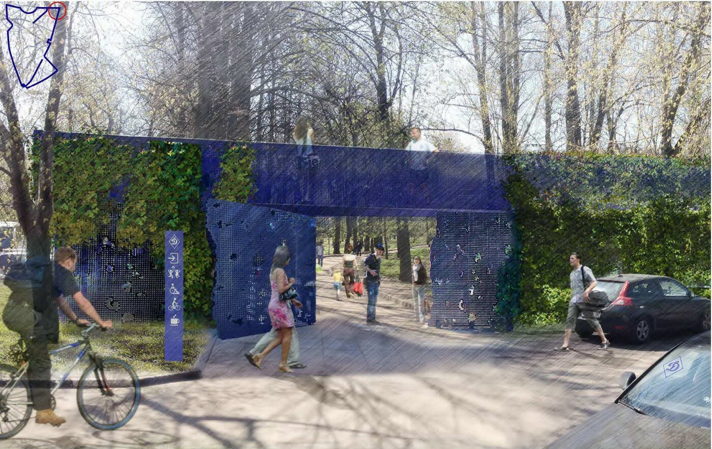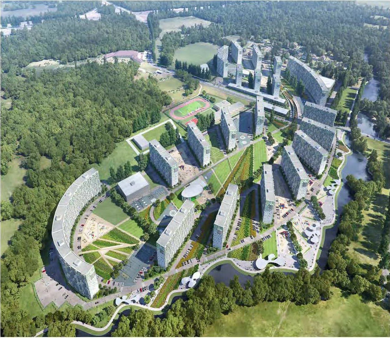 Заказчики поставили перед нами две задачи. Первая, техническая, была сформулирована так: "Вы можете что-то сделать, чтобы и «перо» сохранилось, и инсоляция прошла? «Перо» обязательно должно остаться, потому что оно понравилось губернатору". Понятно, в России главный по архитектуре — местный губернатор, мэр или префект. Вторая и основная задача звучала так: "Вы архитектурой не занимайтесь, у нас есть проекты зданий, и мы их поставим на участке как есть. Вы придумайте, как оформить пространство, чтобы людям было хорошо жить ". Очевидно, что неправильно создавать густонаселенные многоэтажные гетто в подобных местах, без транспортной доступности, без инфраструктуры. Заказ симптоматичен, потому что заказчики понимали, какой кошмар они делают, и попытались компенсировать его продуманным отношением к среде. Для этого проекта мы сначала связали пешеходным мостом два участка, разделенные трассой. Другая проблема была в том, что узкие дворики между домами были заполнены автомобильными парковками. При этом двором для всех этих жилых единиц служил один большой треугольном сквер. Мы децентрализовали рекреацию, спроектировали разные общественные пространства, добавили развитую зону рекреаций вдоль реки.