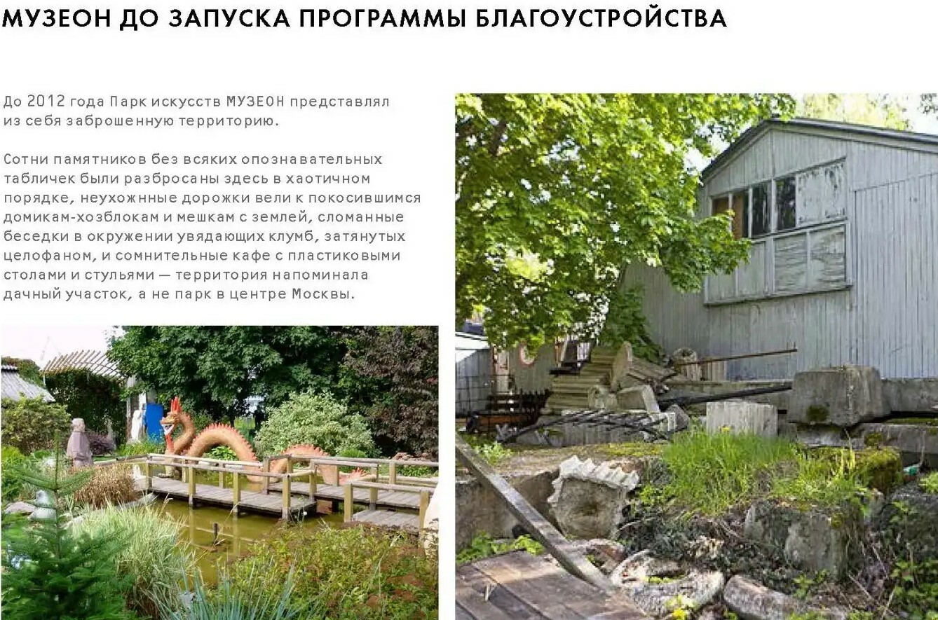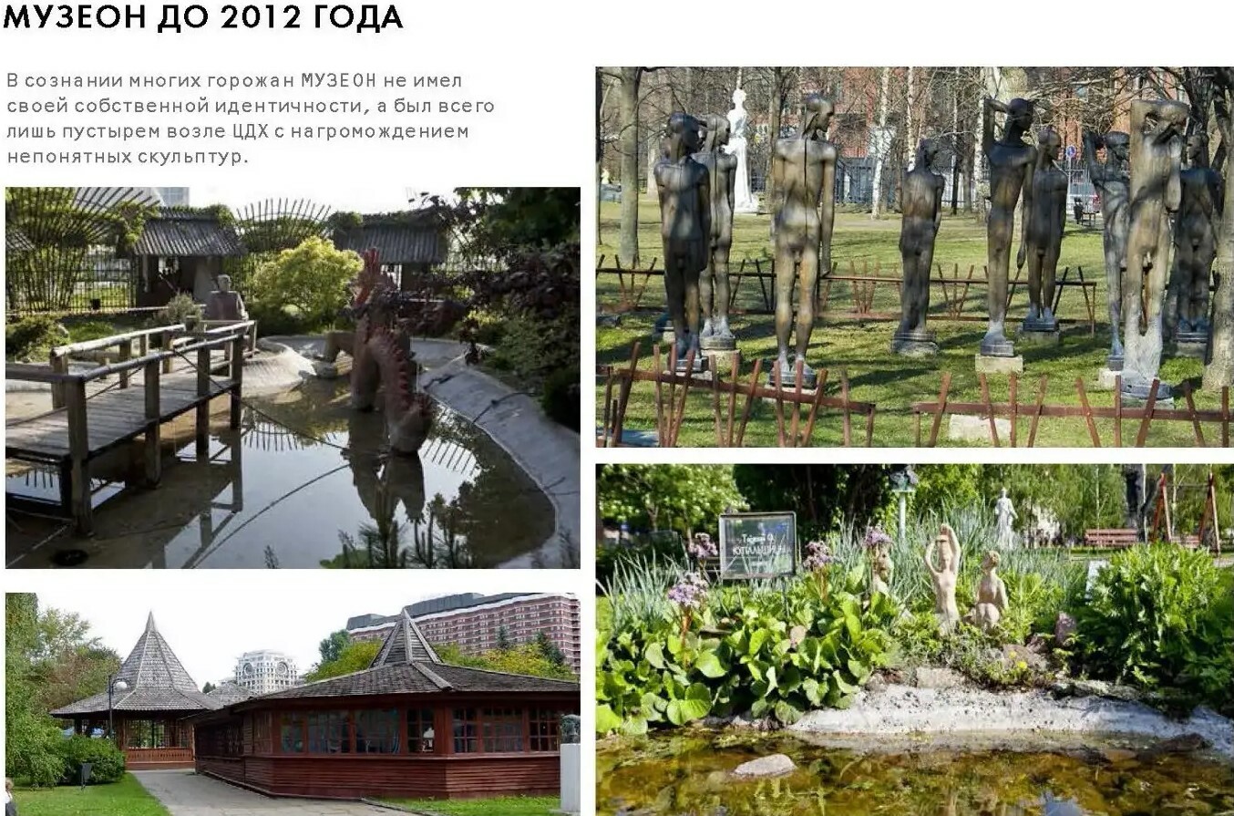 Будучи открытыми пространствами, парки могут лучше многих выполнять коммуникационную миссию, быть площадкой встречи близлежащих культурных центров, общественных и образовательных институций. Если по соседству проходит какой-нибудь форум или выставка — парк может стать точкой взаимодействия и общих проектов. Такой подход, в том числе, служит инструментом экономической оптимизации: у них деньги — у вас площадка, у вас тема — у них эксперт и т.д. Это требует анализа не только территориального, но и ресурсного. Так у «Музеона» есть сосед-гигант Парк Горького, но у них нет музейного фонда. Совсем рядом от нас расположена живая активная культурная площадка института «Стрелка», но у них территория ограничена. Я буду настаивать на том, что любое открытое пространство — это культурный проект, а не только «зеленка». В парке я могу сделать культуру доступной: без очередей и с внятной подачей.
